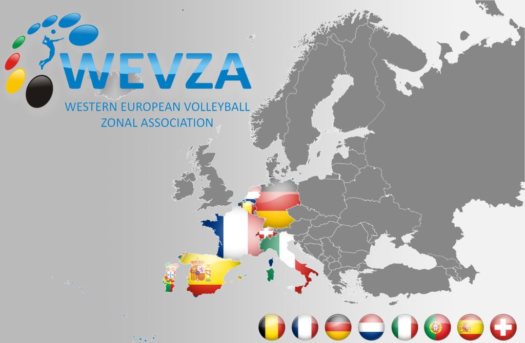 Founding and current members of the Western European Zonal Volleyball Association (WEVZA) are the Volleyball National Federations of: BELGIUM, FRANCE, GERMANY, ITALY, PORTUGAL, SPAIN, SWITZERLAND and THE NETHERLANDS.